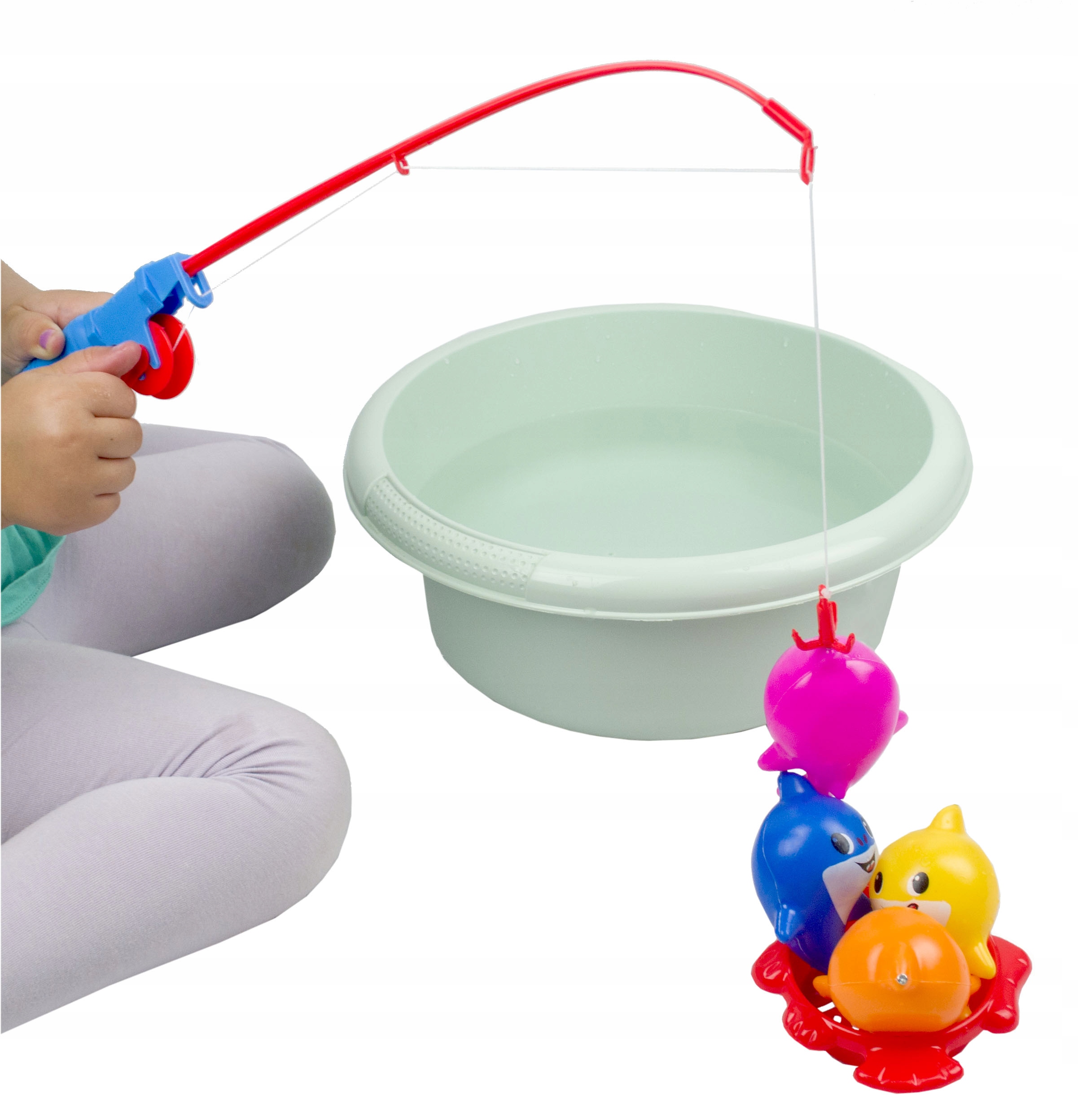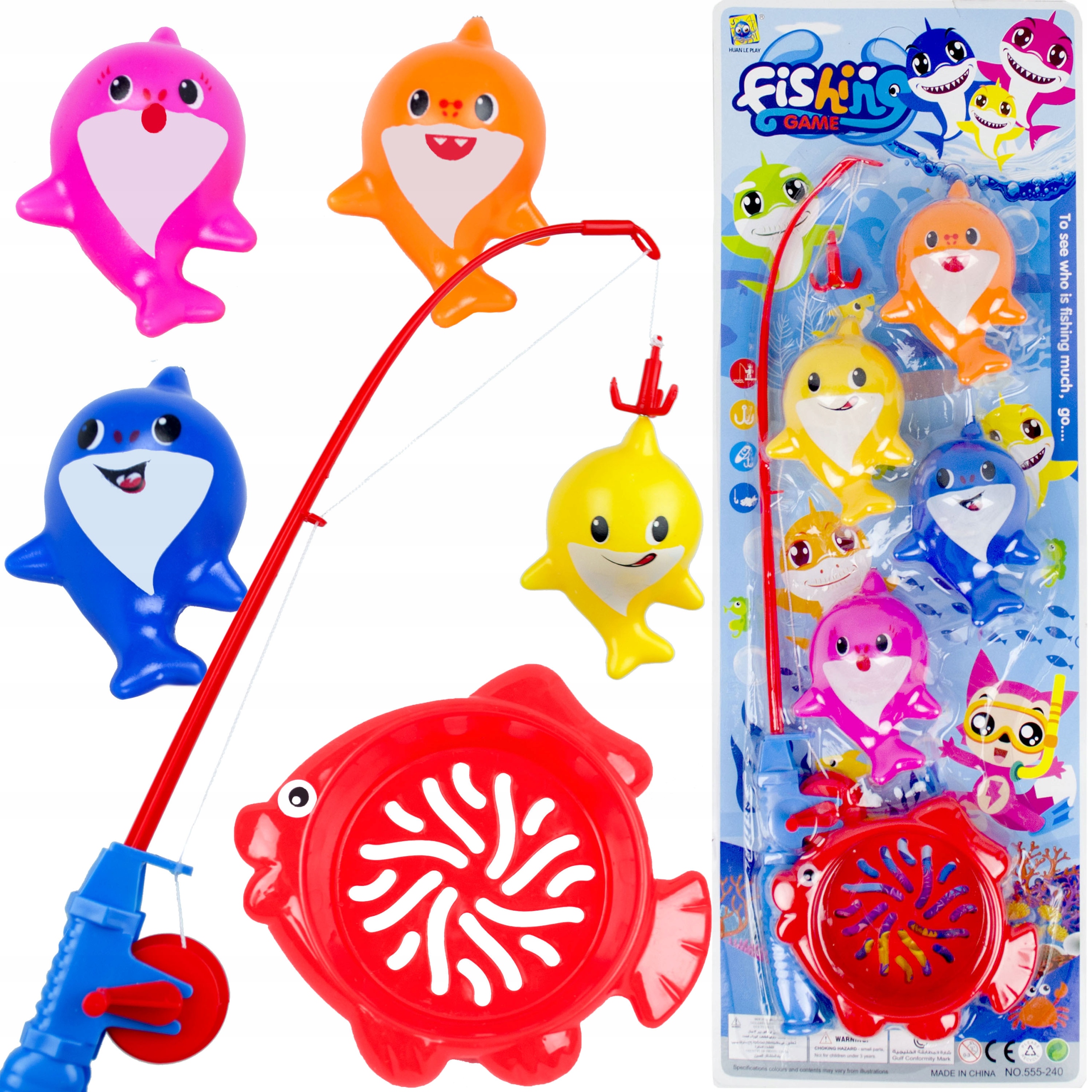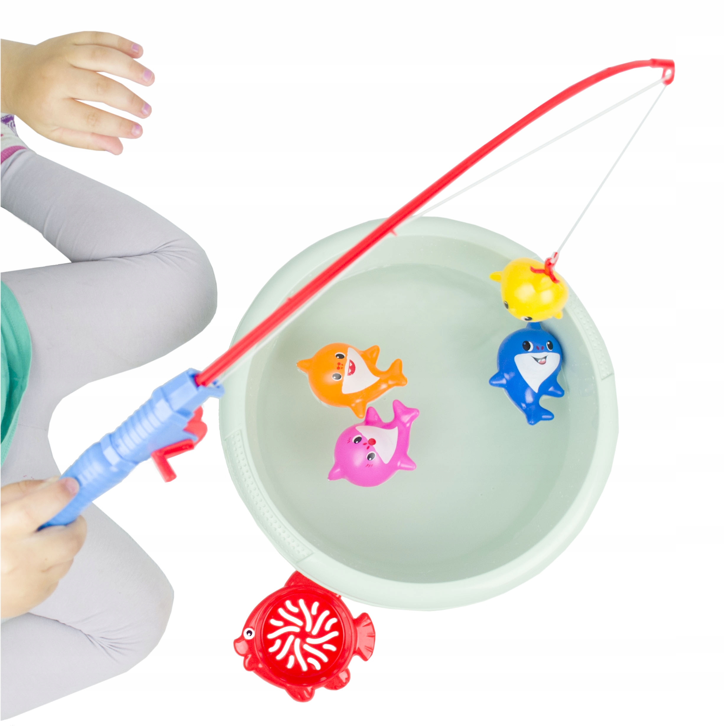 Zestaw zawiera 4 kolorowe rekiny, wędkę z korbką oraz podbierak. Rekiny oraz haczyk wędki mają zamocowane magnesy, które po zbliżeniu się do siebie łączą się i pozwalają złowić niesfornego rekina. W tej pracy pomoże także podbierak, który ułatwi schwytanie kolorowej ryby. Zestaw można wykorzystać podczas zabawy w domu, jak i na dworze, podczas kąpieli w wannie i na wakacjach. Zajmuje mało miejsca i jest wygodny w transporcie.