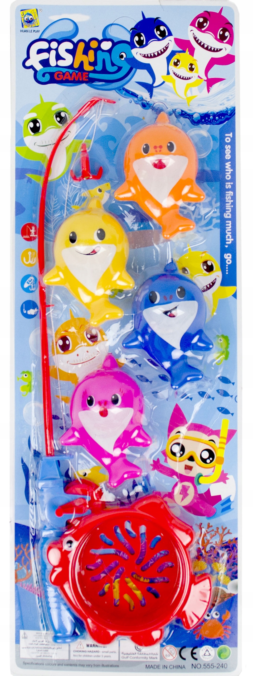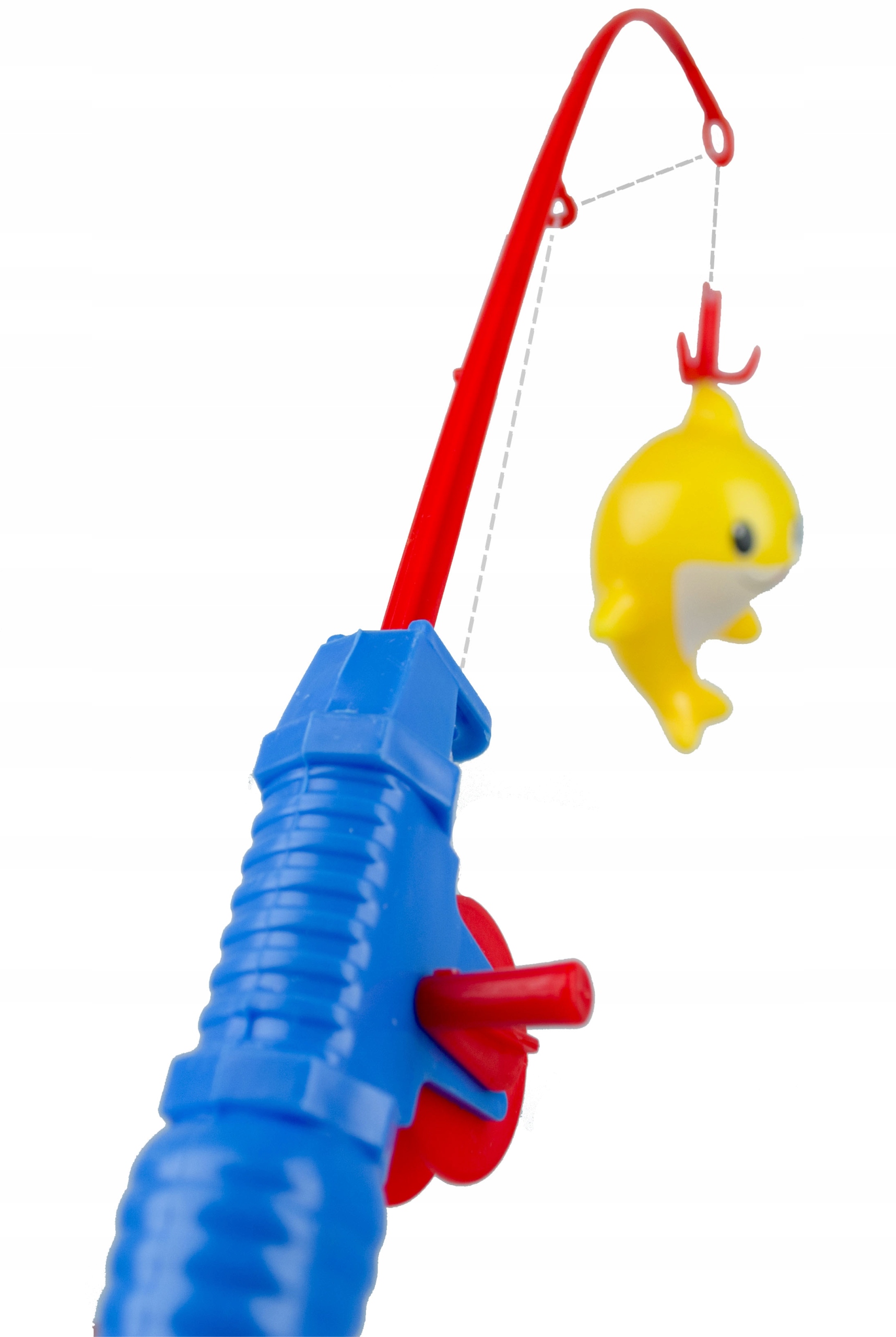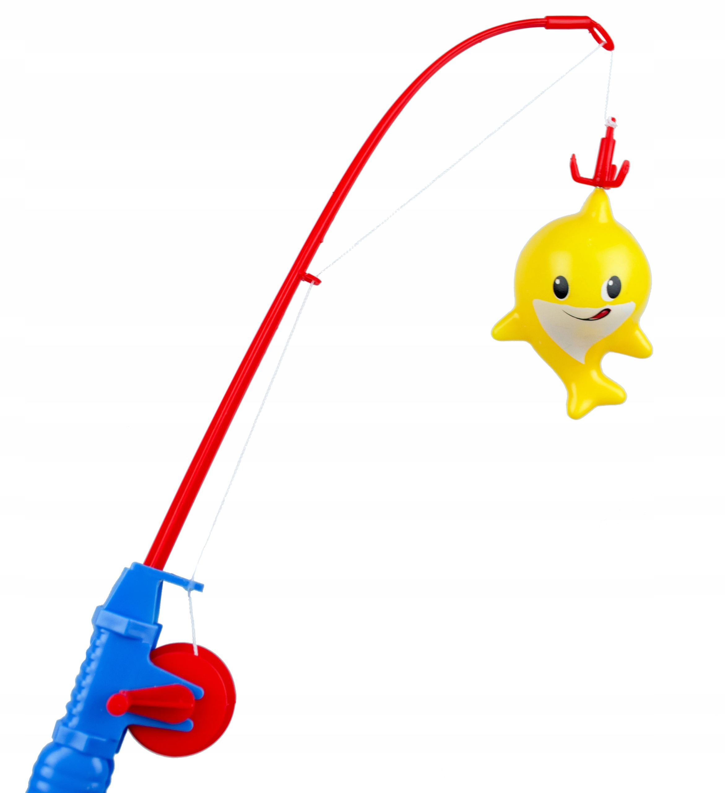 Zestaw zawiera 4 kolorowe rekiny, wędkę z korbką oraz podbierak. Rekiny oraz haczyk wędki mają zamocowane magnesy, które po zbliżeniu się do siebie łączą się i pozwalają złowić niesfornego rekina. W tej pracy pomoże także podbierak, który ułatwi schwytanie kolorowej ryby. Zestaw można wykorzystać podczas zabawy w domu, jak i na dworze, podczas kąpieli w wannie i na wakacjach. Zajmuje mało miejsca i jest wygodny w transporcie.