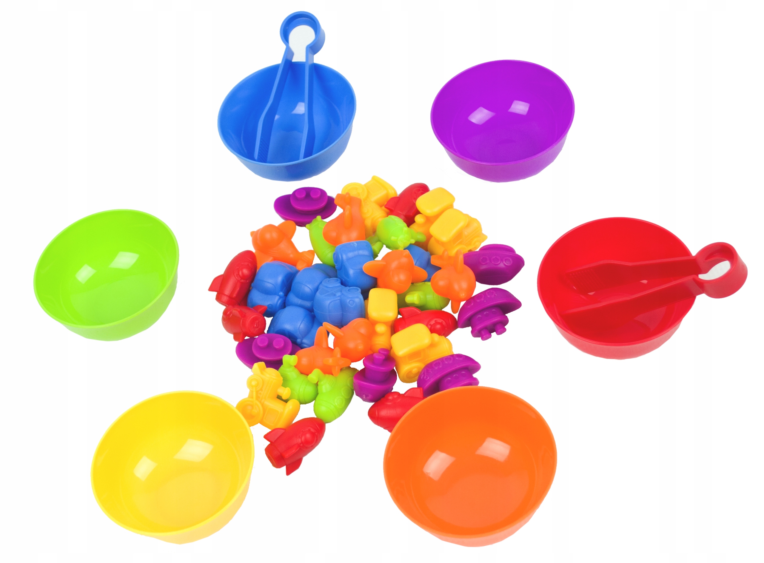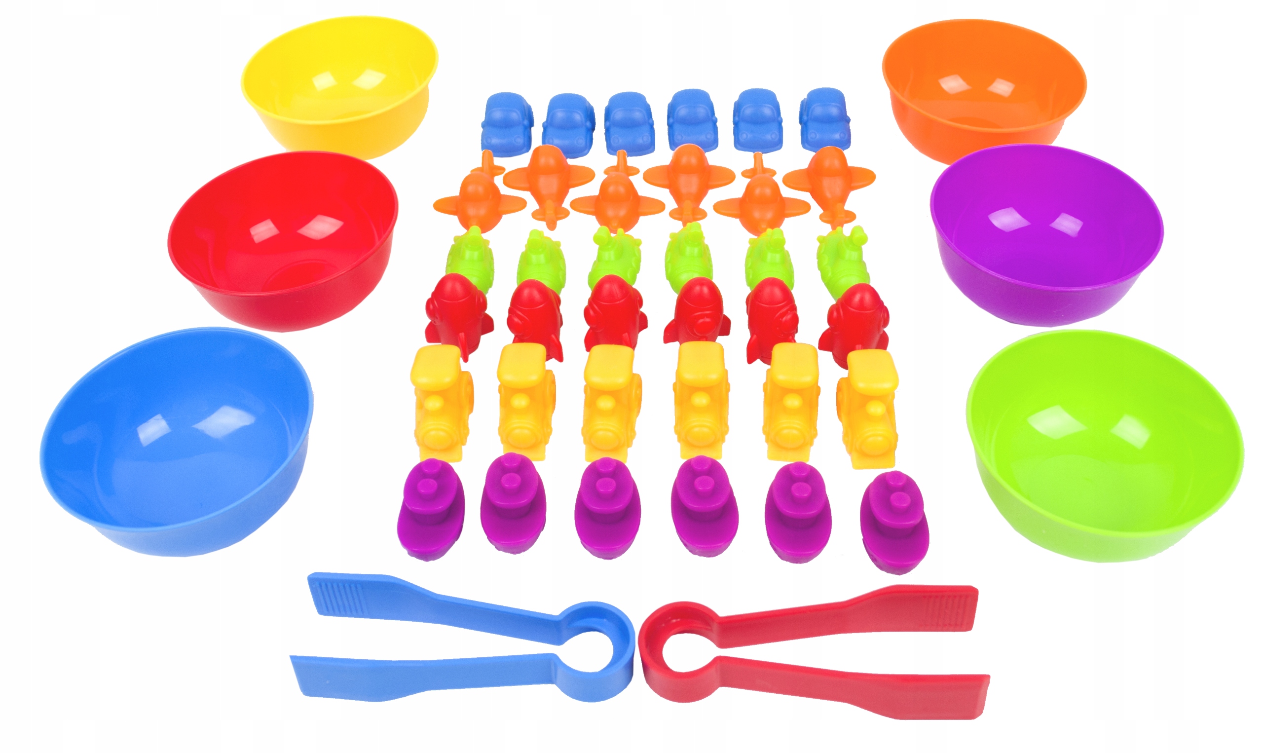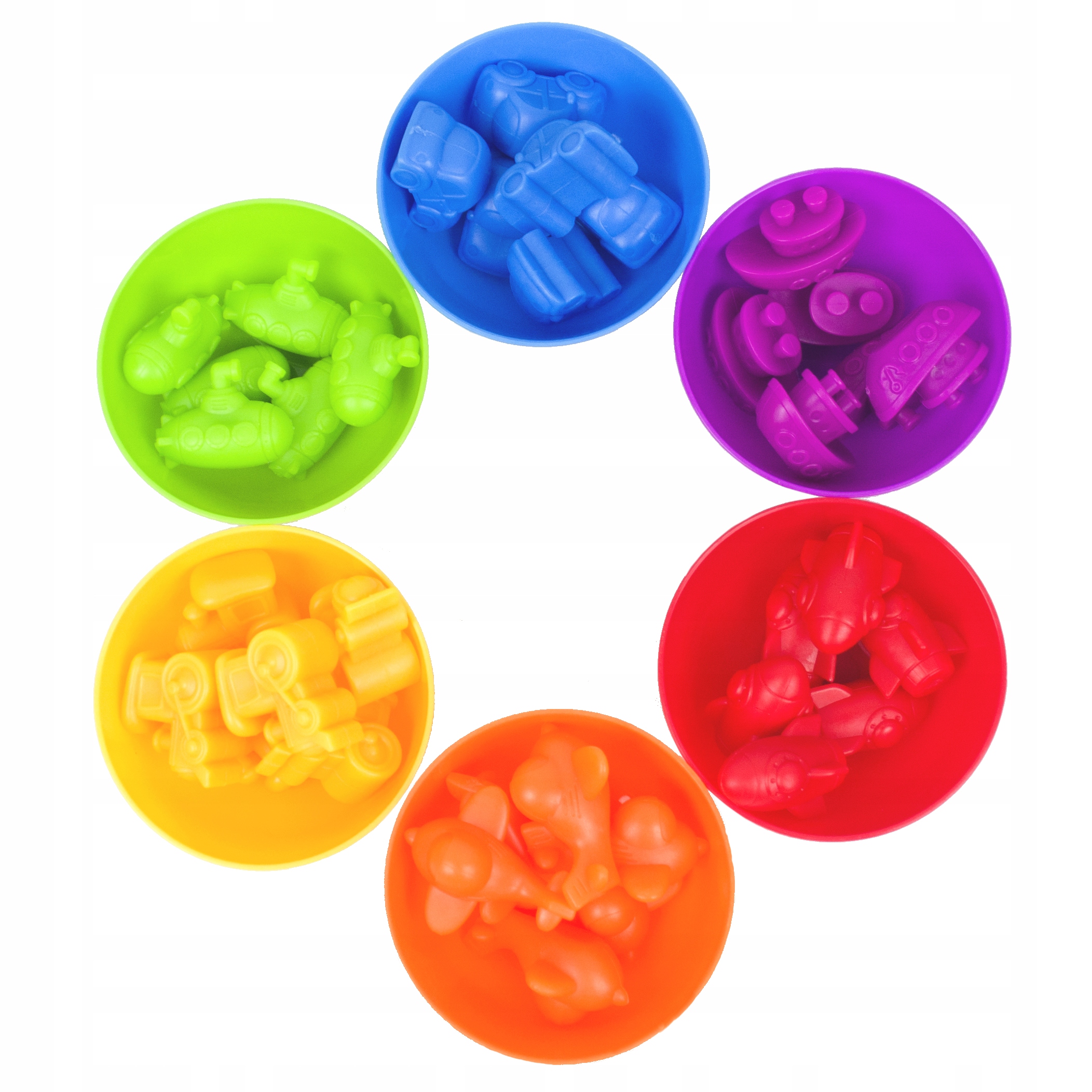 Zestaw składa się z 6 miseczek i 36 figurek (po 6 z każdego koloru). Występują one w barwach podstawowych: czerwony, żółty i niebieski oraz w barwach pochodnych: pomarańczowy, zielony i fioletowy. Jest to doskonały przykład dla dzieci przy nauce mieszania barw. Figurki oprócz odmiennej kolorystyki posiadają różne kształty: statek, samolot, samochód, łódź podwodna, rakieta i lokomotywa.