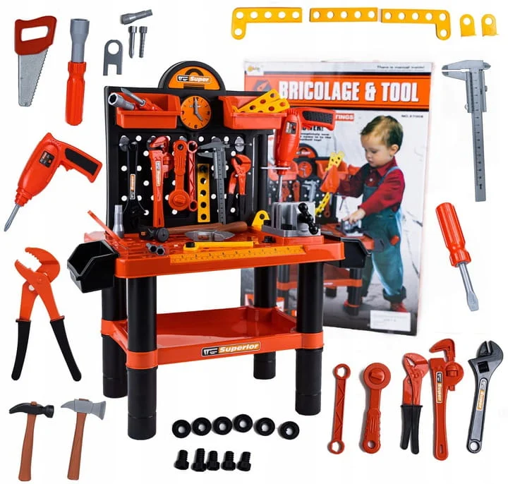 Zaprojektowany z myślą o bezpieczeństwie, nasz zestaw zawiera narzędzia takie jak śrubokręt, młotek, klucz, piła, klucz francuski, śrubki, nakrętki, wkrętaki, wiertarka, które są lekkie i wygodne dla małych rączek. Wszystkie elementy zestawu są łatwe do przechowywania dzięki licznych schowkom, które pomagają utrzymać porządek w trakcie i po zabawie.
